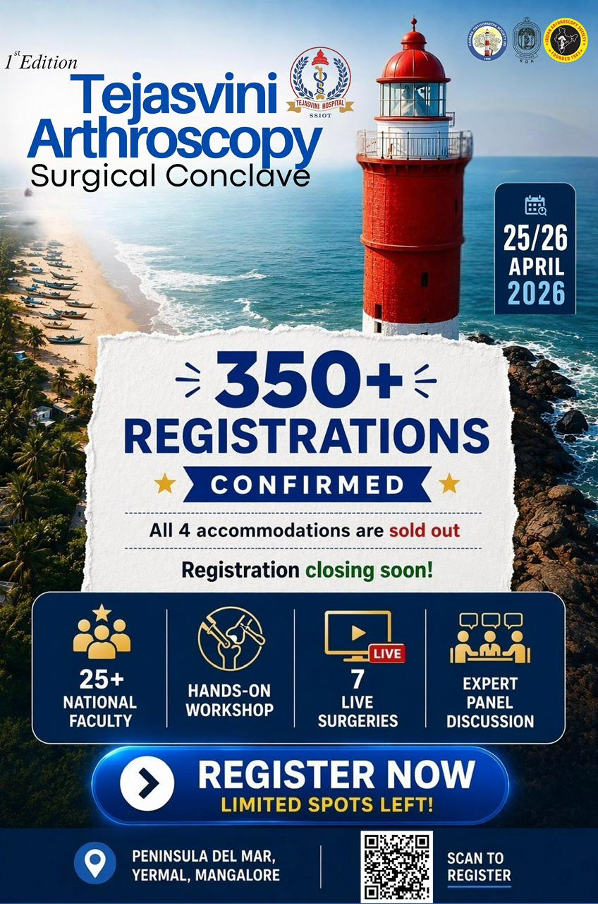 We are delighted to welcome you to the 1st Tejasvini Arthroscopy Surgical Conclave (TASC), taking place on 25th & 26th April 2026 in the beautiful coastal city of Mangalore, conducted by Tejasvini Hospital.
